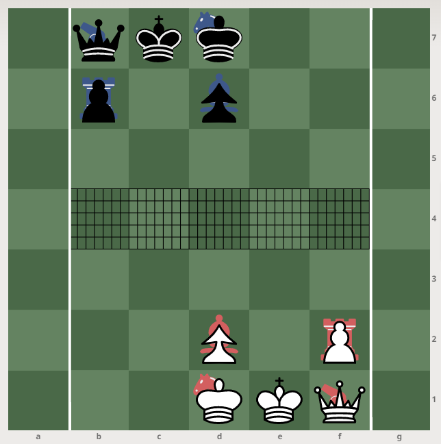 Uma variante fenomenal que utiliza as dimensões de uma quadra de tênis e peças que alternam seus movimentos entre peças de "minions" (tipo de peões) e "campeões" (peças de movimentação mais longa).